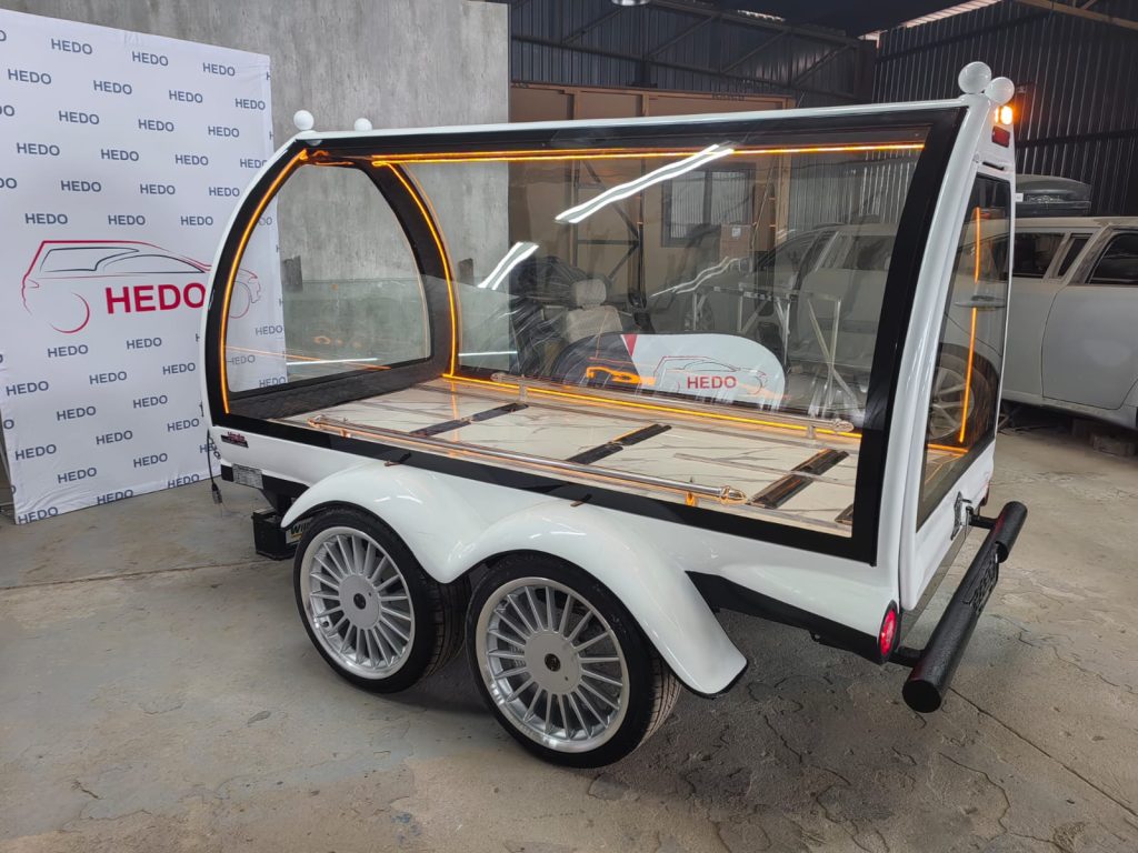 With a demand for something unique and elegant for the funeral industry we developed the Mark 2 Hearse Trailer aka (Fergason Trailer). This allows you to connect any Vehicle, Motor bike or Mini Bus and do a beautiful service.